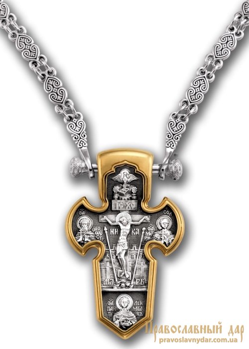Оборот креста открывается величественной фигурой Архангела Михаила, архистратига, то есть верховного военачальника небесного воинства (пам.21 ноября). Его имя означает «Кто яко Бог?», так как он самый могучий и грозный враг зла. Он первым ополчился на денницу, когда тот восстал против Бога, низверг его с Неба и не перестает сражаться с его темным воинством. На голове Архангела вьются ленточки, называемые тороки (или слухи). Они символизируют чуткий слух и внимание к Богу.